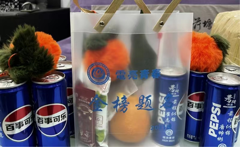 大礼包有橙子,寓意心想事成;专属百事可乐,寓意独一无二与事事开心;牛奶,寓意牛气冲天;毛绒柿子挂件,寓意好事发生;士力架,寓意能量满满,棒棒糖,寓意你们最棒;水果茶包与暖宝宝,寓意温暖整个冬天。所有礼物都承载着学院对考研学子们的深深祝福,由衷祝愿学子们考研顺利,梦想成真!