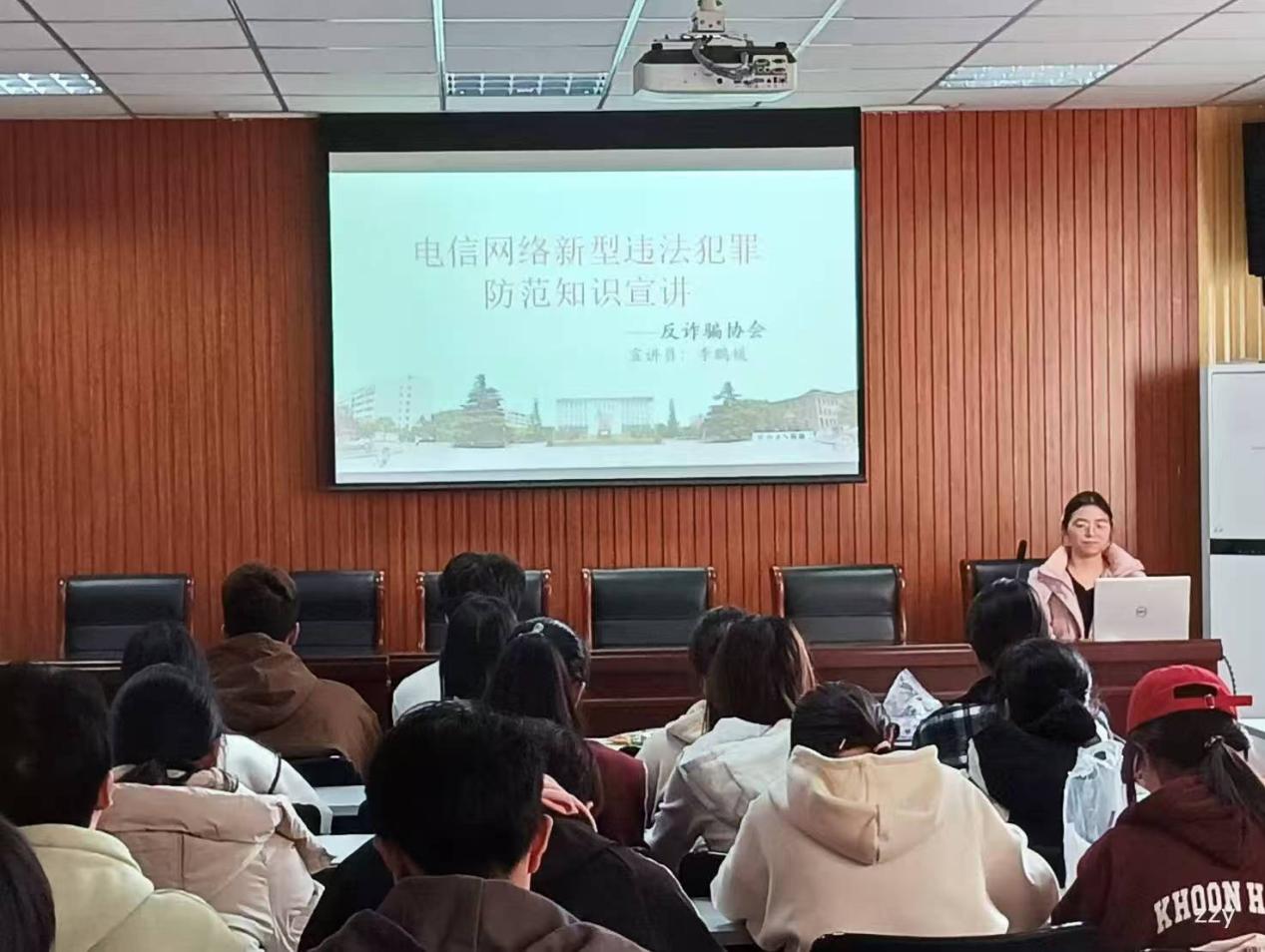 为增强新生的防范意识,加强学生安全教育,切实增强大学生的网络安全防范意识,12月1日下午,我院开新生防范电信诈骗知识专题讲座,2024级新生参加,讲座由学校反诈骗协会社员、2024级电子信息一班李鹏媛担任主讲人。