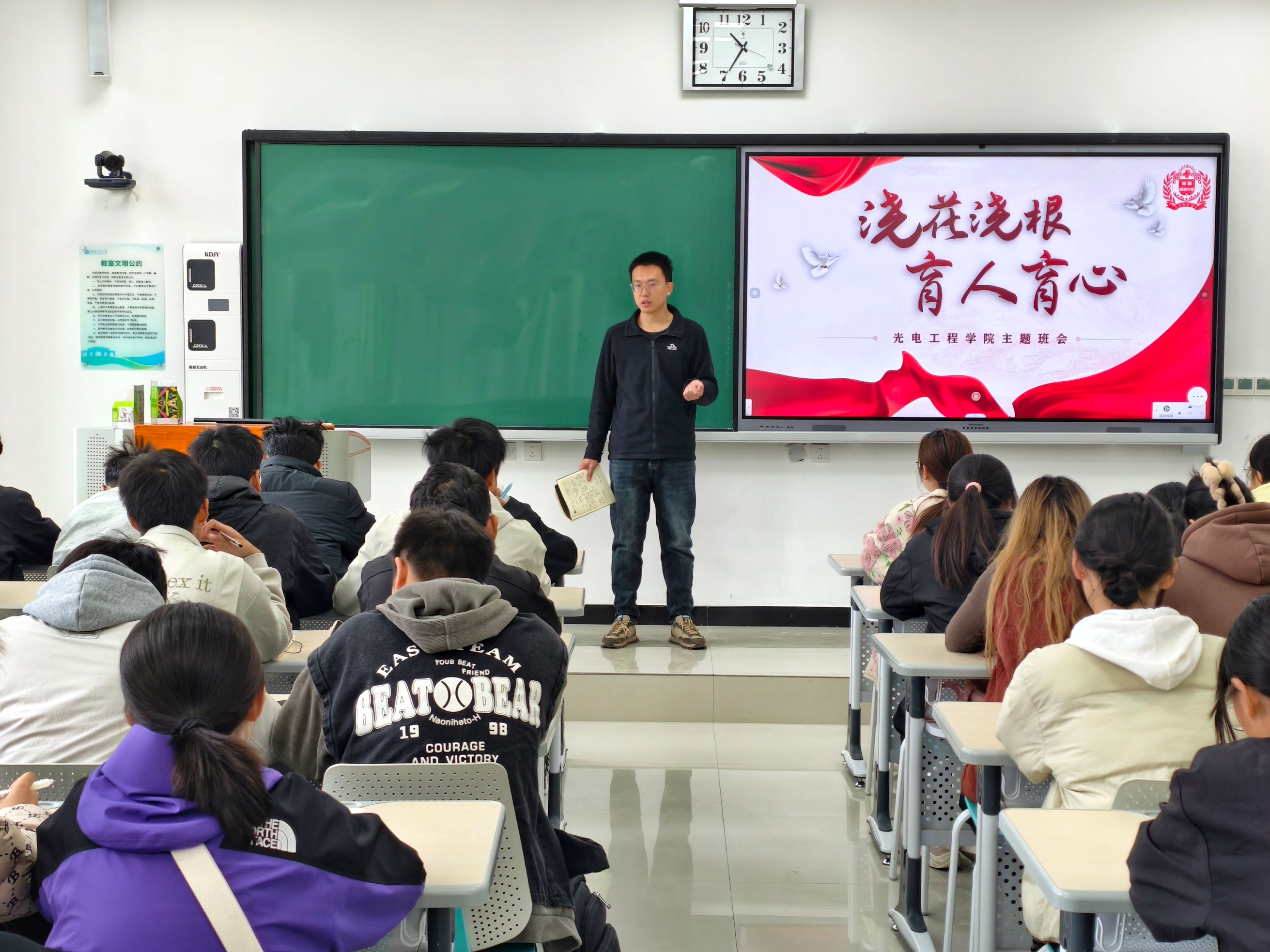 班会上,辅导员王博首先对“浇花浇根,育人育心”这一主题进行了深刻阐释。他指出,教育的根本在于心灵的滋养与品格的塑造,并具体阐述了四个核心维度:一是深植理想之根,淬炼家国之心,强调要将个人发展融入国家前途命运,树立远大报国志向;二是夯实品德之根,涵养君子之心,要求学生骨干以身作则,明大德、守公德、严私德;三是培育坚韧之根,修炼平常之心,告诫大家在面对困难与挫折时,要保持定力,磨砺意志,坦然面对得失;四是扎牢实践之根,永葆为人之心,鼓励同学们在实践中增长才干,同时不忘人性本真,常怀仁爱之心。为加深理解,王博还精心选取了功勋人物的感人事迹视频片段进行播放,并结合现实生活中的典型案例进行分析,以生动鲜活的形式匡正思想,提醒和督促学生骨干时刻反省自身,明确责任担当。
