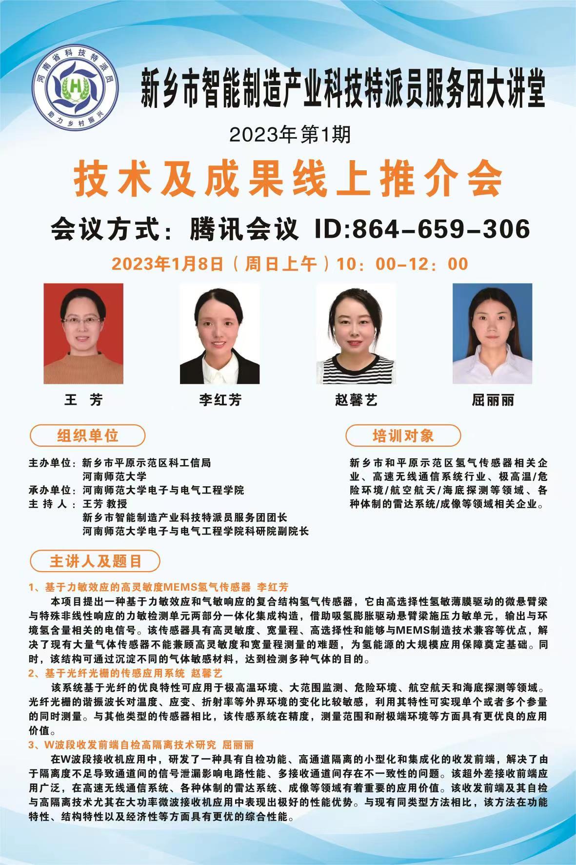 2023年1月8日,新乡市平原示范区科工信局及我校再次共同举办了新乡市智能制造产业科技特派员服务团大讲堂技术及成果线上推介会,会议由新乡市智能制造产业科技特派员服务团团长、我院副院长王芳教授主持。