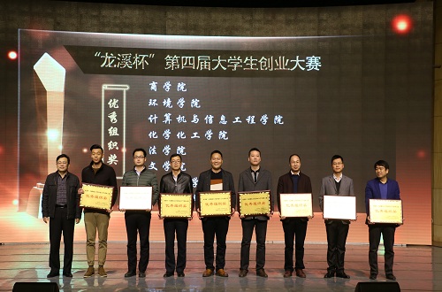 经过各学院的积极推荐、评委的认真遴选、专家的指导培训和初赛的激烈角逐,共有12支参赛团队成功晋级决赛。下午两点半,大赛在紧张热烈的气氛中拉开帷幕,项目路演、现场答辩和创业分享三个环节次递进行。本场决赛形式新颖、亮点众多,选手和评委不时思维碰撞、言语交锋,创业分享别具匠心、扣人心弦。其中,文学院新乡ICH文化传播有限公司团队带来的“非遗新时代”创业分享通过精心编排的情景剧生动形象地展现了先进的产业理念、清晰的企业战略与完善的管理体系;商学院知了云教育团队带来的“‘小知了们’的大梦想”通过多场景演绎深刻再现了该团队创新创业的心路历程。参赛团队以极富创意的分享赢得现场观众的阵阵掌声,伴随着评委的精彩点评,历经三个多小时的比赛落下帷幕。在随后的颁奖典礼上,就业创业指导服务中心主任赵新生宣读了本届大赛的获奖名单。“启律问宝”——OTO共享律师获得一等奖,百特锂电科技有限公司等两个团队获得二等奖,创奇膜衣工作室等三个团队获得三等奖,新乡市国韵中药文化发展有限公司等六个团队获得优秀奖。孙志波、陈勇等十二位老师获得优秀指导教师奖,生命科学学院、化学化工学院等八个学院获得优秀组织奖。