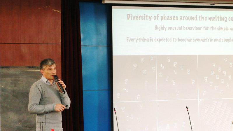 报告会中,Eugene Gregoryanz教授以“What diamond anvil cell can do: a perfect window into the world of extreme conditions”为题,从什么是极端条件讲起,列举了存在极端压力、极端温度以及同时满足极端压力和温度的例子,随后提出为什么极端条件的研究是有意义的。通过展示钠在200GPa压强下成为透明绝缘体,氧在100GPa的压强下成为金属和超导体,碳与金刚石在不同压强下的转换,植物和恒星是极端条件下的天然实验室,引起大家对报告的浓厚兴趣。与此同时,Eugene Gregoryanz教授向我们展示了宇宙中不同压力范围所对应的情形。结合对压强研究历史的回顾,得出产生压强的两种方式:动压(激光驱动冲击波)和静压(金刚石对顶砧);进而回顾了静压的发展和当前所能达到的极限。Eugene Gregoryanz教授详细讲解了压强对碱金属、氢相变的影响,并且给出如何利用拉曼光谱来研究相变过程。会后Eugene Gregoryanz教授详细解答了师生提出的相关问题。Eugene Gregoryanz教授的报告循序渐进、深入浅出,使在座师生对极端条件和极端过程的研究有了新的认识。
