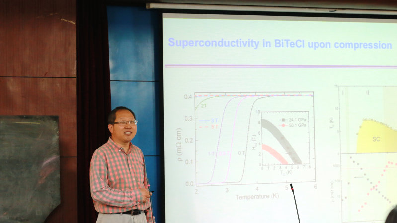 接着,我校1990级校友陈晓嘉教授作了题为“Tuning quantum topology, thermoelectricity, and superconductivity for energy applications”的报告。陈晓嘉研究员的报告包括以下三个方面:1)压力诱导热电性质的增强;2)压力诱导超导电性;3)对基体材料中已经存在的超导电性和拓扑序的检验。报告中,他讲解了如何评价和测量热电材料,阐述了通过压力诱导增强材料的优值和超导性的机理。最后他指出通过压力诱导热电材料提供了一条诱导超导性、甚至实现拓扑超导性的新途径。陈教授的报告通俗易懂,为相关理论计算的老师提供了新的思路和启发。会后陈晓嘉教授与相关老师进行了深入的学术交流。