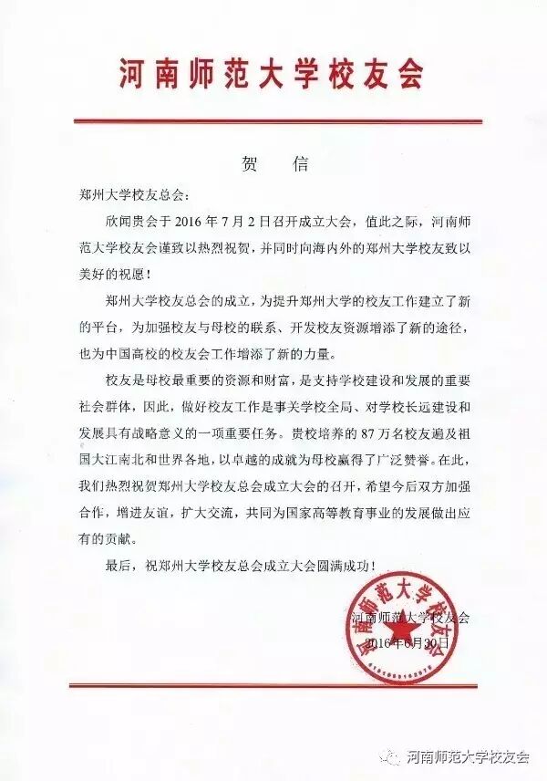 2016年7月2日上午,郑州大学校友总会成立大会暨第一次会员代表大会在主校区综合管理中心第一报告厅隆重召开。我校校长常俊标受邀参会祝贺,伟德官网下载苹果版校友会专程发去贺信并赠送贺礼。校友办魏海琴主任率队全程观摩大会并实地学习郑州大学校友返校日活动。