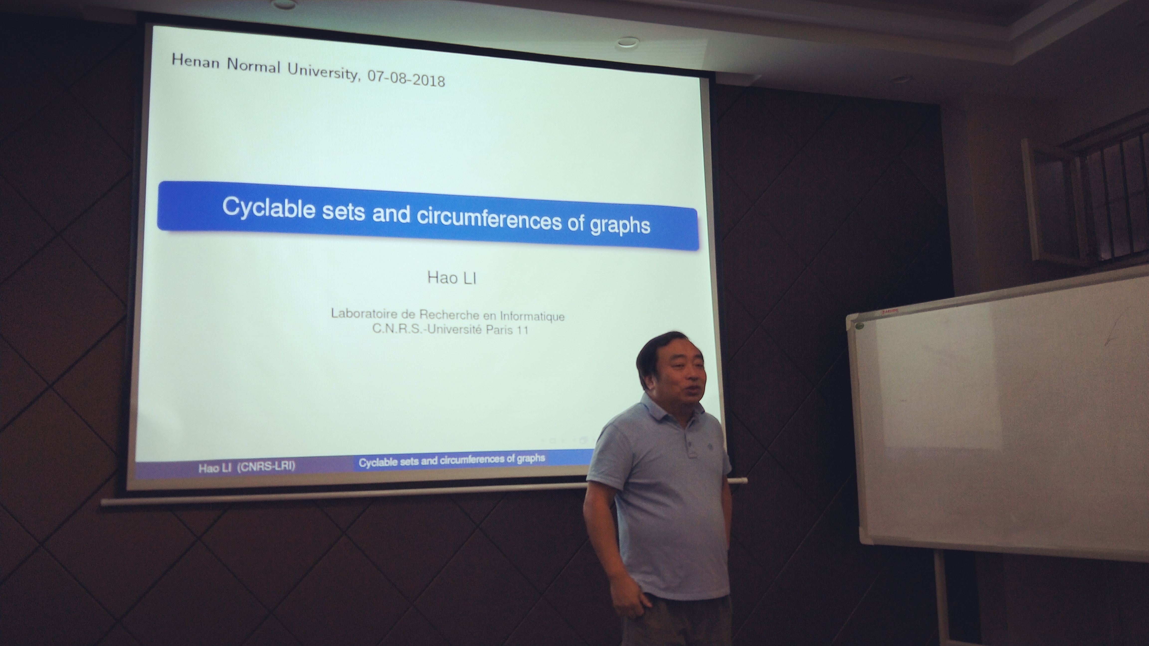 受数学与信息科学学院邀请,法国国家科学研究中心主任研究员李皓于8月7至9日访问我校。8月7日下午,李皓作了题为“Cyclable sets and circumferences of graph”的学术报告。数学学院相关负责人、青年教师和研究生代表共二十余人聆听了报告。报告会由学院院长苗雨主持。