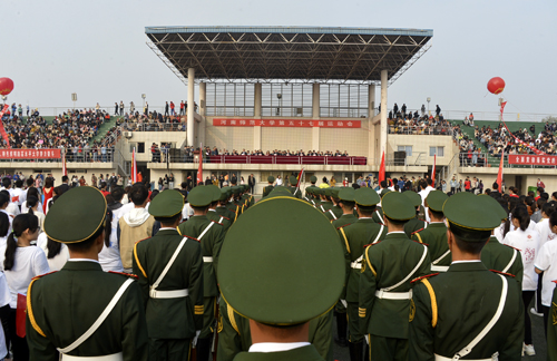 李学志宣布我校第五十七届运动会开幕式正式开始。在庄严的国歌声中,五星红旗冉冉升起,校旗和运动会会旗随后伴随着校歌依次升起。