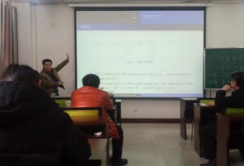 胡红钢以《New Provably Secure Pseudorandomness Generators From Block Ciphers》为题,向到场师生介绍了优于国际标准ANSI X9.17中的设计方法的一种适合并行的可证安全伪随机发生器的设计研发。他指出信息安全领域中的安全均是计算安全,这里所说的计算是指图灵计算,而计算又涉及到物理学、数学、生物学等众多的领域。在此基础上,胡红钢介绍了一种伪随机序列发生器的设计原理、设计方法,以及由此发生器生成的序列的安全性分析的结果。他还向大家展示了最终的分析报告中各项测试指标的情况。最后,他基于自己的研究经历,讲解了在信息安全领域研发的经验以及研究生培养的体会。