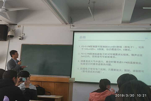 林炜平以《具有能量分辨和质量分辨的中性粒子探测技术研究》为题,向师生介绍了中性粒子探测技术的研发情况。在报告中他首先从聚变研究出发,围绕实验向工程堆迈进,系统的研究设计方案,以及NPN诊断国内外现状等方面向师生介绍了实验研究背景。他基于自己的研究内容,介绍了ps+sipm探测器X射线测试的过程,明确指出ps+sipm探测器可探测到6kev的X射线,可用于大于20kev的H2O探测,但仍需进行H、D测试,准确地指出了在剥离单元、剥离介质以及NPN标定技术中存在的一些难题。林炜平基于自己的研究经历,细致讲解了在具有能量分辨和质量分辨的中性粒子探测技术研究方面的经历。