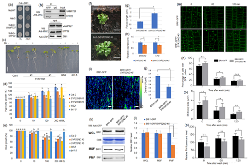 近日,我校生命科学学院张亮副教授与沈阳农业大学玄元虎课题组合作在著名学术期刊New phytologist上发表了题为 SYP22 and VAMP727 regulate BRI1 plasma membrane targeting to control plant growth in Arabidopsis的研究论文,发现SNARE蛋白SYP22和VAMP727结合并运输内吞的BRI1到细胞膜激活BR信号。论文第一署名单位为伟德官网下载苹果版,张亮副教授、沈阳农业大学硕士研究生刘洋和朱晓峰副教授为共同第一作者。
