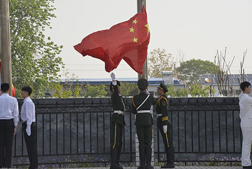 李学志宣布我校第五十八届运动会开幕式正式开始。五星红旗在庄严的国歌中冉冉升起。随后,校旗和运动会会旗伴着校歌依次升起。