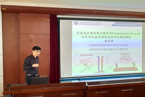 杨洪新以《界面拓扑磁结构关键参量Dzyaloshinskii-Moriya相互作用及垂直磁各向异性的理论研究》为题,主要向师生介绍了铁磁/MgO界面巨垂直磁各向异性(PMA)及界面Dzyaloshinskii-Moriya相互作用(DMI)方面的相关研究。在报告中他指出磁斯格明子存储器具有非易失、尺寸小、驱动速度快、驱动电流小等特点,且有望实现非易失、高容量、高速度、低功耗。之后他深入阐述了有关巨大PMA及界面DMI的研究方法、优势及所解决的问题。