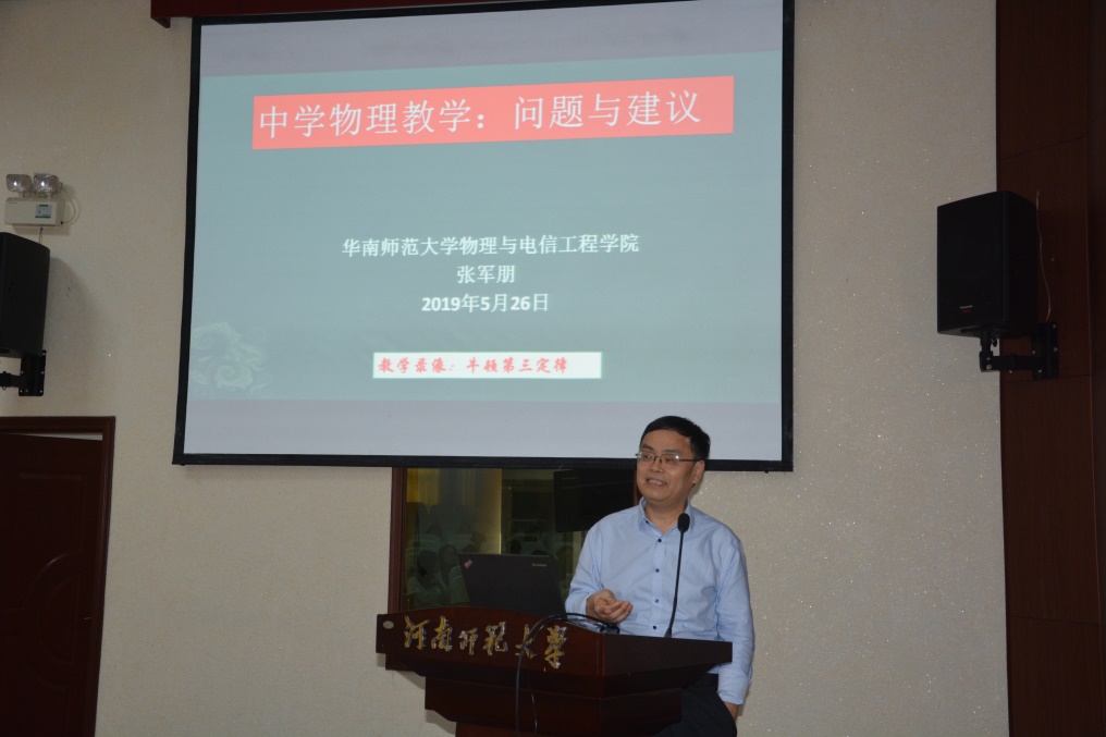 张军朋以《中学物理教学:问题与建议》为题,主要向师生介绍了物理课堂教学改革的方向、课堂教学的现状及反思等内容。在报告中,他首先介绍了物理核心素养的内涵,明确了课堂教学所需要发生的改变。紧接着又通过四个典型案例,对物理教学中的问题进行了深入反思。之后他又结合多次听课的感受,总结概括了物理教学中存在的问题。最后,张军朋围绕教学中的问题及反思,分别就理念和观念问题、物理课堂教学优化问题、探究问题、实验教学问题、导学案问题、教材的把握和处理以及教学设计等多个方面提出了一些建议。