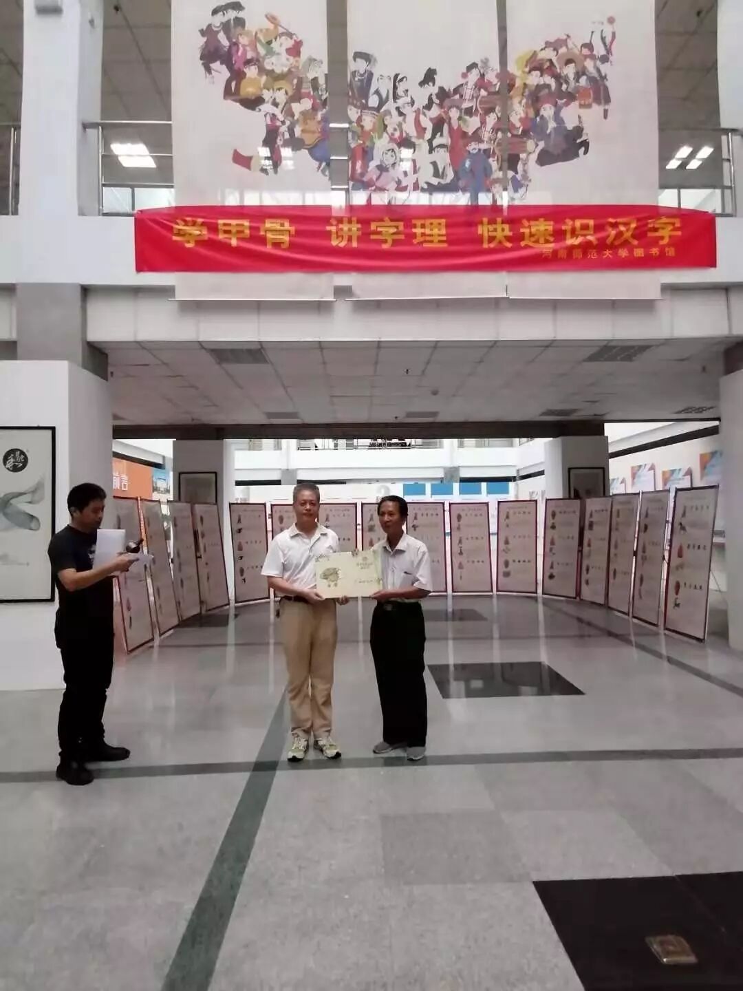 姬克喜讲述了本次展览的意义,他指出甲骨文是中华文化真正的基因密码,对于更好地服务教学科研、认知与传承中华文化具有重要的意义。姬克喜向图书馆捐赠了甲骨文系列丛书,赵荣栓馆长代表图书馆接受捐赠并向姬克喜颁发捐赠证书,他指出发掘甲骨文的过程意义,甲骨文是我国古代最早、体系较为完整的文字体系,将中华文化的记载推进至商代。