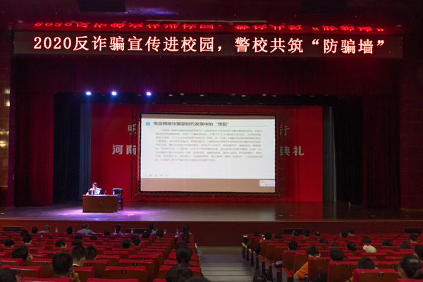 9月30日上午,保卫处、学生处联合洛阳市刑侦支队反诈骗中心、古城公安分局开展了“2020反诈骗宣传进校园,警校共筑‘防骗墙’”活动。洛阳市刑侦支队反诈骗中心警官、古城公安分局干警、保卫处干部职工、全体学工干部以及新老学生代表约900余人参加了活动。