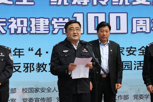 “国安才能国治,治国必先治安。”4月15日,在第六个全民国家安全教育日到来之际,我校在西校区校训石广场举行2021年“4·15”全民国家安全教育日主题展暨反邪教宣传教育进校园活动启动仪式。新乡市公安局副局长刘跃江、校党委副书记陈广文出席活动并讲话,新乡市公安局、牧野公安分局和我校相关职能部门负责人及师生代表共400余人参加活动。活动由校党委稳定办公室主任秦法跃主持。
