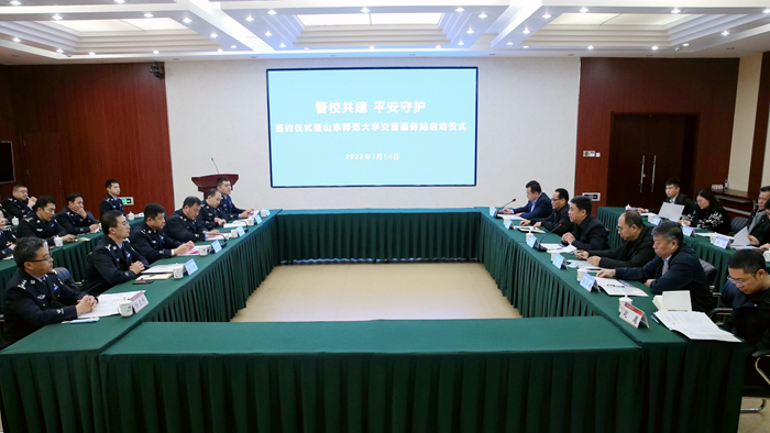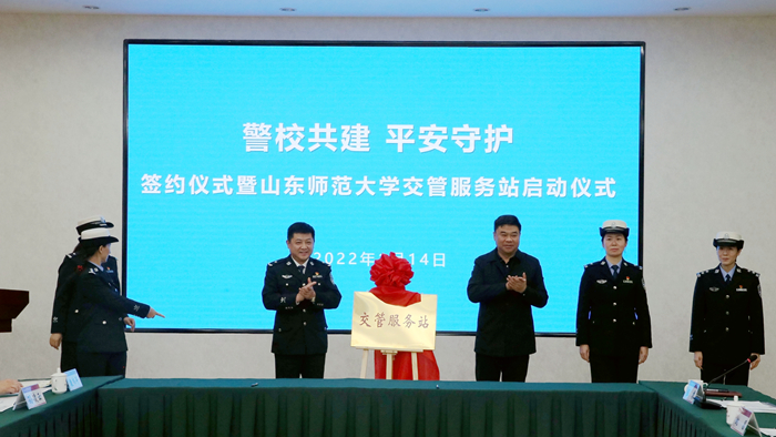 1月14日上午,学校与济南市公安局交通警察支队历下大队“警校共建、平安守护”签约仪式暨山东师范大学交管服务站启动仪式在千佛山校区举行。副校长邢光,济南市公安局交通警察支队党委副书记、车管所所长韩军庆出席仪式并致辞,共同为交管服务站揭牌。启动仪式由公安处处长程乘主持。