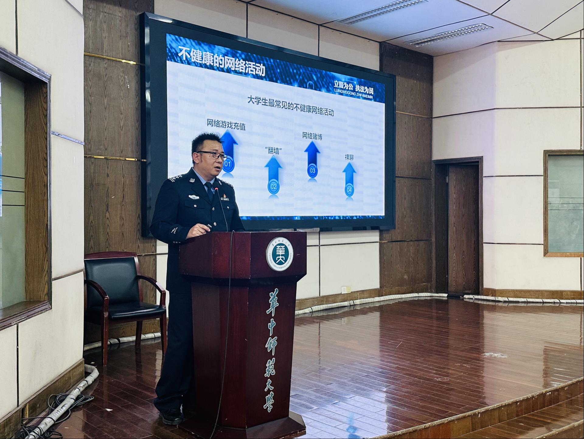 (通讯员:李宁宁 瑛超拉姆 摄影:闻聪)为进一步贯彻总体国家安全观,加强大学生法制教育,增强自我保护能力,促进校园和谐稳定,3月22日下午,由党委学生工作部与保卫处联合主办,校美美与共民族团结教育工作室承办的“法制护航,平安成长”法制安全讲座在9号楼1楼报告厅顺利举办。本次讲座特邀武汉市公安局文化保卫局陶涛警官主讲,武汉市公安局文化保卫局、校保卫处、学工部相关领导老师出席,来自不同学院的近两百名各族学生参加。活动由学工部民族办老师阿力夏特主持。