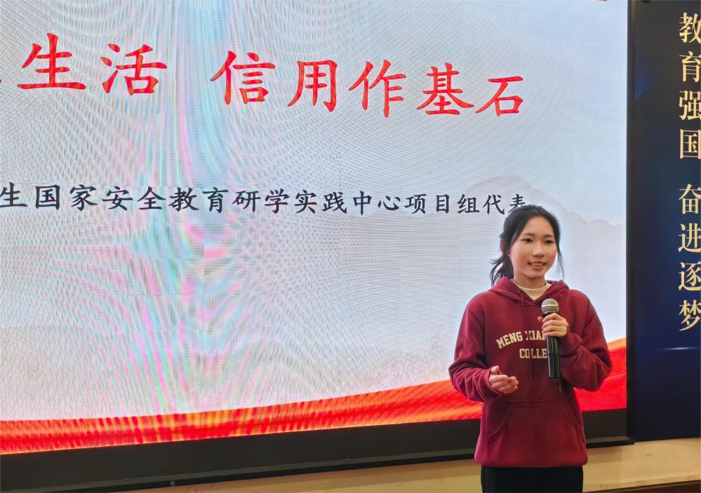 2021年,在上海学生安全教育研究中心、我校保卫处、学工部指导下,孟院联合文保分局成立了上海高校首个“大学生国家安全教育研学实践中心”。会上,研学实践中心项目组代表蔡嘉展示微课:金融无大小,国安“卫”你我。“信用,既是维护金融安全的现实需要,也是对中华传统美德——诚信的传承与践行”,蔡嘉通过列举生活中的鲜活案例,讲述了信用与金融安全的关系,警醒同学们要注重保护个人信用。研学实践中心项目组代表王雨欣在主题微课展示中,以一张照片背后蕴藏着的保密信息为切入点,呼吁全体学员增强对国家安全的敏感性,绷紧国家安全这根弦。