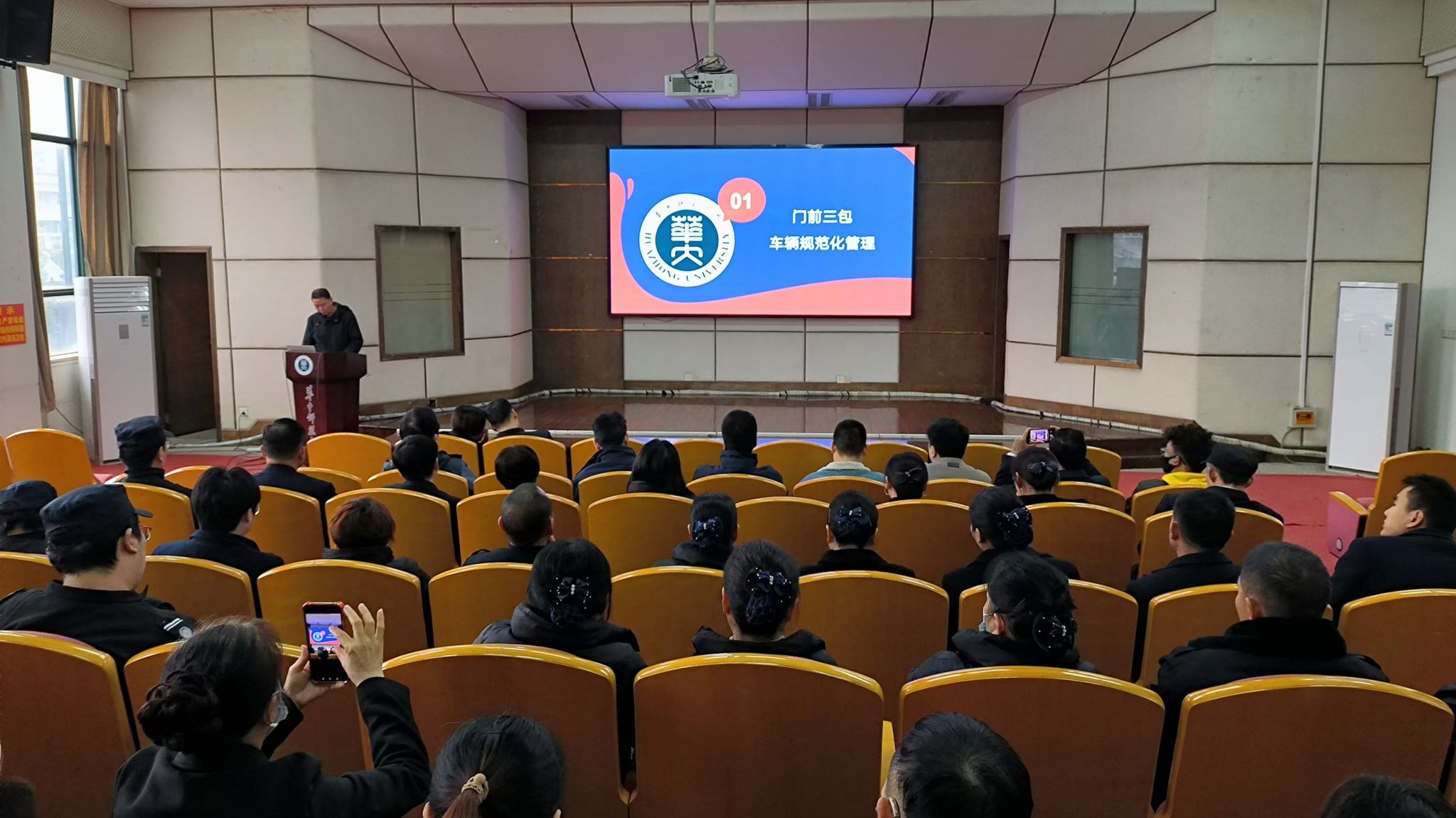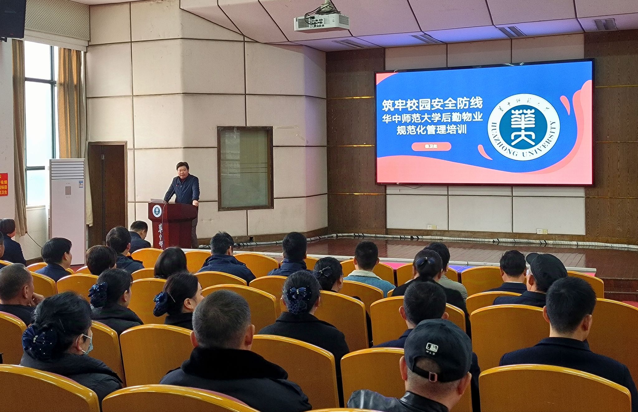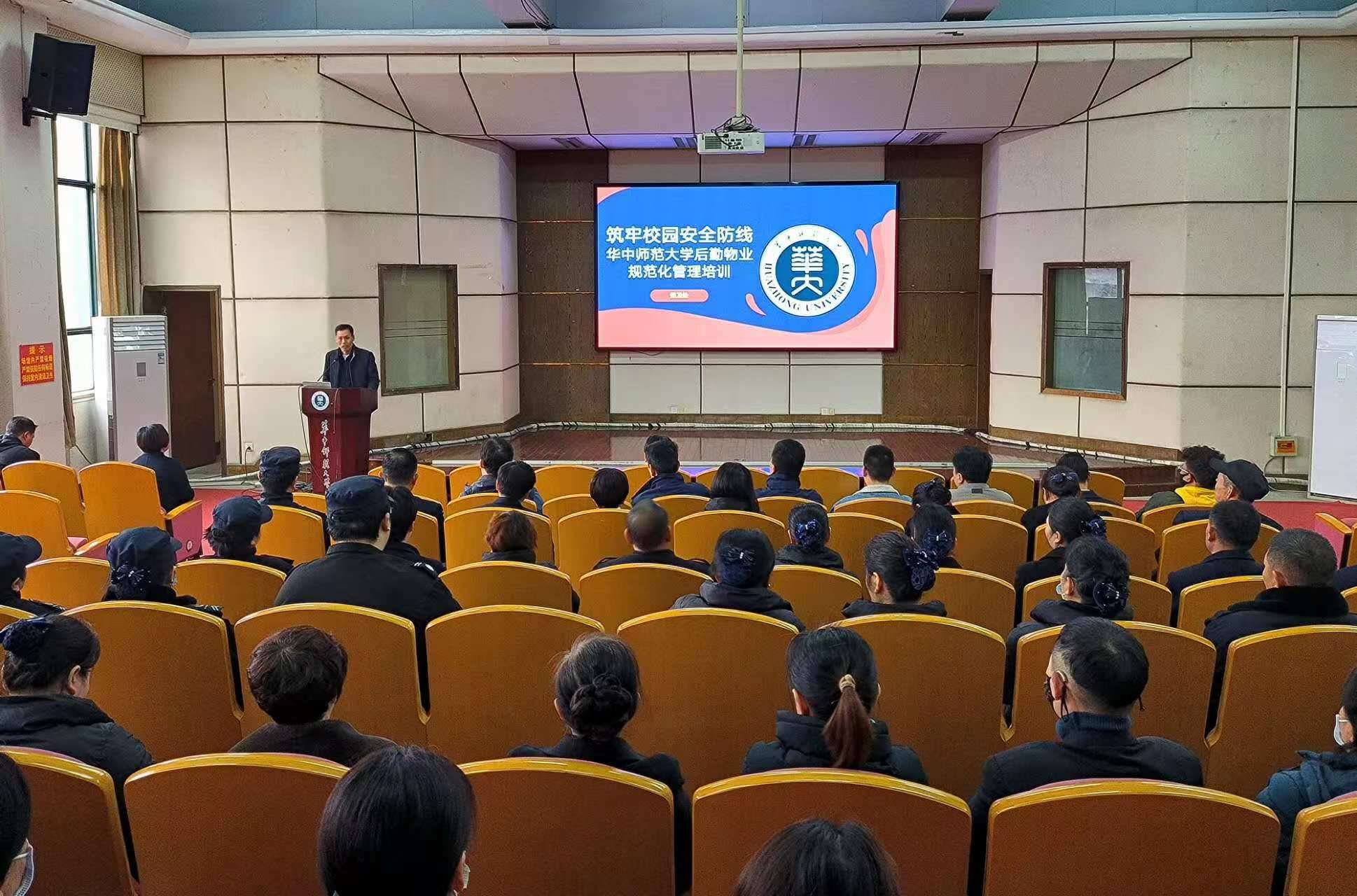 3月11日下午,由保卫处、后勤保障部联合举办的“华中师范大学后勤物业规范化管理培训”在9号楼9101报告厅成功开展。保卫处处长王军、后勤保障部部长袁本芳出席培训并致辞,50余名后勤宿管、物业人员参加培训。