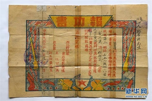 张富清当年的报功书(3月30日翻拍)。新华社记者 程敏 摄