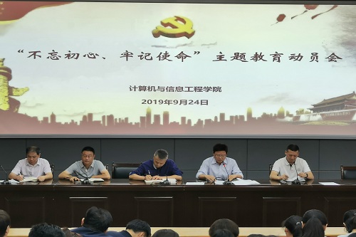 为深入学习贯彻习近平新时代中国特色社会主义思想,积极响应校党委“不忘初心、牢记使命”的主题教育工作部署,9月24日下午,计算机与信息工程学院在学院217报告厅开展“不忘初心、牢记使命”主题教育动员大会。学院领导班子成员、全体教职工党员以及学生党员代表参加了会议。