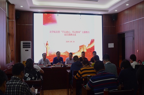 9月24日下午,法学院党委在崇法楼301开展“不忘初心,牢记使命”主题教育动员会议,学院领导班子成员、全体教职工党员以及学生党员代表参加会议。会议由院长王鹏祥主持。