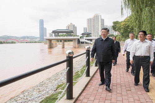 8月19日至22日,中共中央总书记、国家主席、中央军委主席习近平在甘肃考察。这是21日下午,习近平在兰州市黄河治理兰铁泵站项目点,沿步道察看黄河两岸生态修复和景观建设情况。