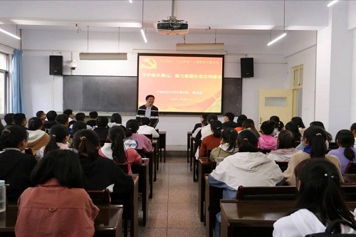曹治国以“守护绿水青山,助力祖国生态文明建设”为主题,从十八大以来以习近平同志为核心的党中央把生态文明建设作为统筹推进“五位一体”总体布局和协调推进“四个全面”战略布局的重要内容入手,领学了习近平总书记关于生态文明建设的新论断新思想的精髓和要义,以及由之带来的党对发展理念、发展方式和执政理念、执政方式的认识的深化与升华,帮助与会同学切身感受到生态文明建设的重要性。曹治国的讲解逻辑清晰、紧扣主线,又深入浅出、便于理解。他对学校最近举办的“创意垃圾桶设计”等环保活动发表了个人见解,让与会同学意识到“守护绿水青山、从我做起”的责任感和紧迫感。课后,曹治国对会员所提出的问题予以耐心解答,并向同学们拓展相关知识,现场气氛热烈。