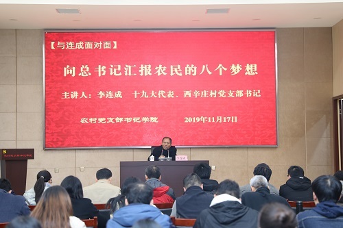 在“与连成面对面”环节,西辛庄村党支部书记李连成为全体学员作了报告。李连成,连续当选党的十六大、十七大、十八大、十九大代表,十届、十一届、十二届、十三届全国人大代表,荣获“全国优秀共产党员”“全国劳动模范”“全国优秀村支书”称号,在报告中,李连成用朴实动情的话语和真实感人的“吃亏”经历讲述了农民的“八个梦想”,生动地演绎着这位“吃亏书记”全心全意为人民服务的纯粹初心和带领村民脱贫致富的担当使命,为在场的全体师生上了一节特殊的“思政课”。