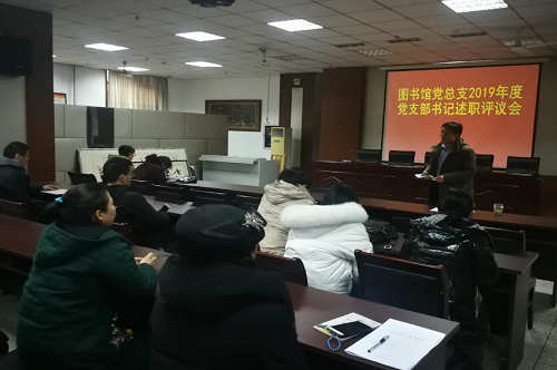 为进一步落实《中国共产党支部工作条例(试行)》,不断强化以党的建设为根本的基层基础工作,增强基层党支部书记抓党建工作第一责任人的意识,12月31日下午,图书馆党总支在馆二楼会议室召开2019年度党支部书记抓党建工作述职评议考核及“五星级党支部”考评工作会。图书馆处级领导干部、党总支委员、支部书记、科级干部及职工党员代表参加会议。会议由图书馆党总支书记石军红主持。
