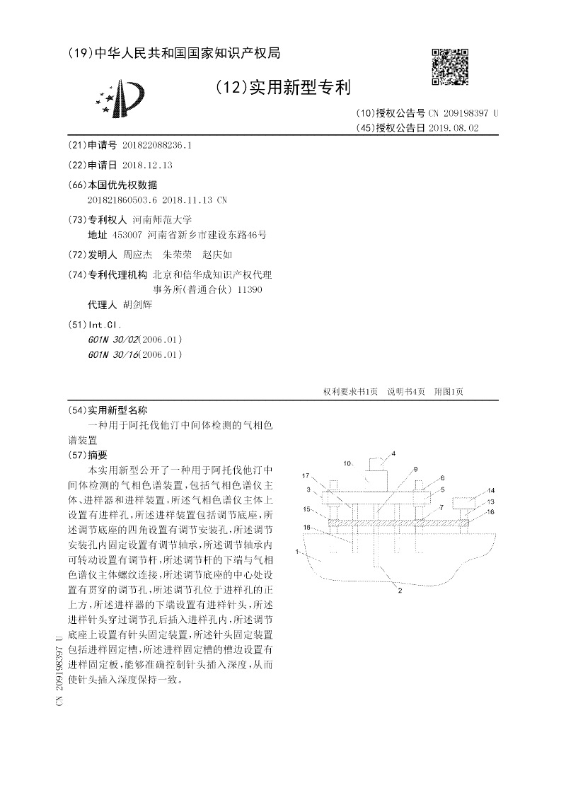| 摘要:本实用新型公开了一种用于阿托伐他汀中间体检测的气相色谱装置,包括气相色谱仪主体、进样器和进样装置,所述气相色谱仪主体上设置有进样孔,所述进样装置包括调节底座,所述调节底座的四角设置有调节安装孔,所述调节安装孔内固定设置有调节轴承,所述调节轴承内可转动设置有调节杆,所述调节杆的下端与气相色谱仪主体螺纹连接,所述调节底座的中心处设置有贯穿的调节孔,所述调节孔位于进样孔的正上方,所述进样器的下端设置有进样针头,所述进样针头穿过调节孔后插入进样孔内,所述调节底座上设置有针头固定装置,所述针头固定装置包括进样固定槽,所述进样固定槽的槽边设置有进样固定板,能够准确控制针头插入深度,从而使针头插入深度保持一致。 |