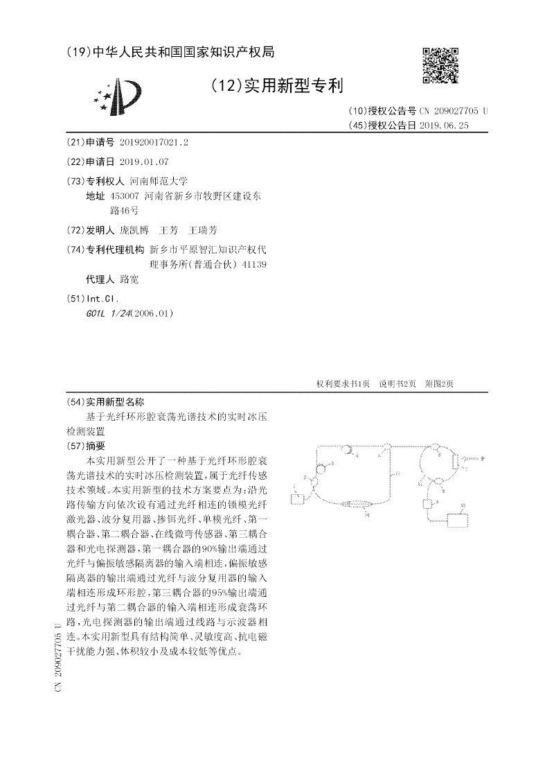 | 摘要:本实用新型公开了一种基于光纤环形腔衰荡光谱技术的实时冰压检测装置,属于光纤传感技术领域。本实用新型的技术方案要点为:沿光路传输方向依次设有通过光纤相连的锁模光纤激光器、波分复用器、掺铒光纤、单模光纤、第一耦合器、第二耦合器、在线微弯传感器、第三耦合器和光电探测器,第一耦合器的90%输出端通过光纤与偏振敏感隔离器的输入端相连,偏振敏感隔离器的输出端通过光纤与波分复用器的输入端相连形成环形腔,第三耦合器的95%输出端通过光纤与第二耦合器的输入端相连形成衰荡环路,光电探测器的输出端通过线路与示波器相连。本实用新型具有结构简单、灵敏度高、抗电磁干扰能力强、体积较小及成本较低等优点。 |