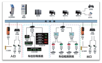车位引导系统采用三级引导设计,首先场外分层余位屏显示楼层空余车位信息;其次,场内引导屏显示区域空余车位信息;最后,根据车位指示灯快速停车。