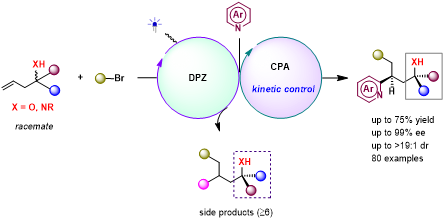 在合成化学领域,如何精准控制自由基反应路径堪称“圣杯级”挑战。自由基,因具有超高反应活性,常引发不可控的副反应——这一特性既赋予其强大的合成潜力,也导致传统方法难以实现单一产物的选择性合成。江智勇教授团队独辟蹊径,创新性提出“化敌为友”的研究思路:通过动力学调控将副反应纳入可控体系,将自由基的“活泼天性”转化为合成优势。经过不懈努力,成功锁定一种三组分Minisci反应:即利用外消旋的高烯丙醇/胺、氧化型自由基源和氮杂芳烃,通过对高活性自由基中间体的动力学控制,成功实现了目标产物和副产物的“分流”,从而以简单合成子,获得了极具高附加值的多手性氮杂芳烃化合物。