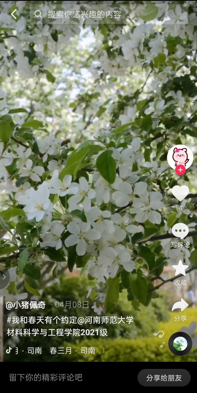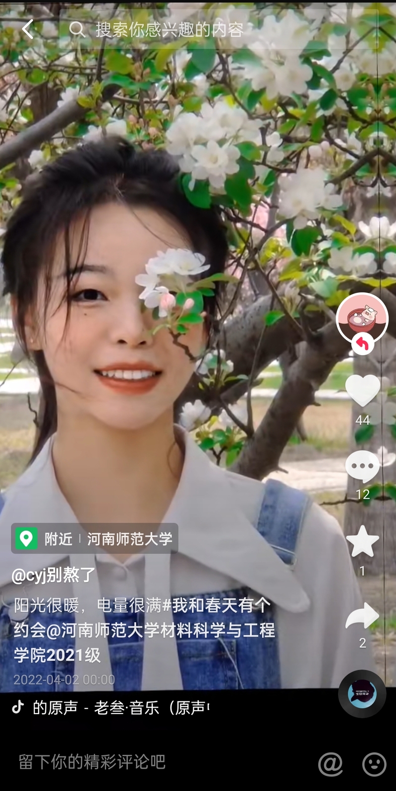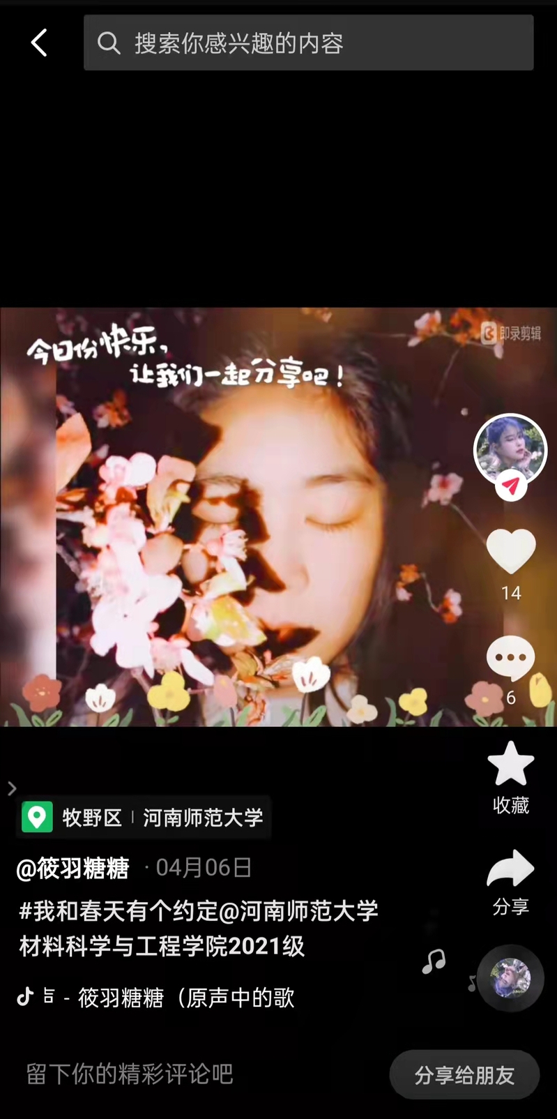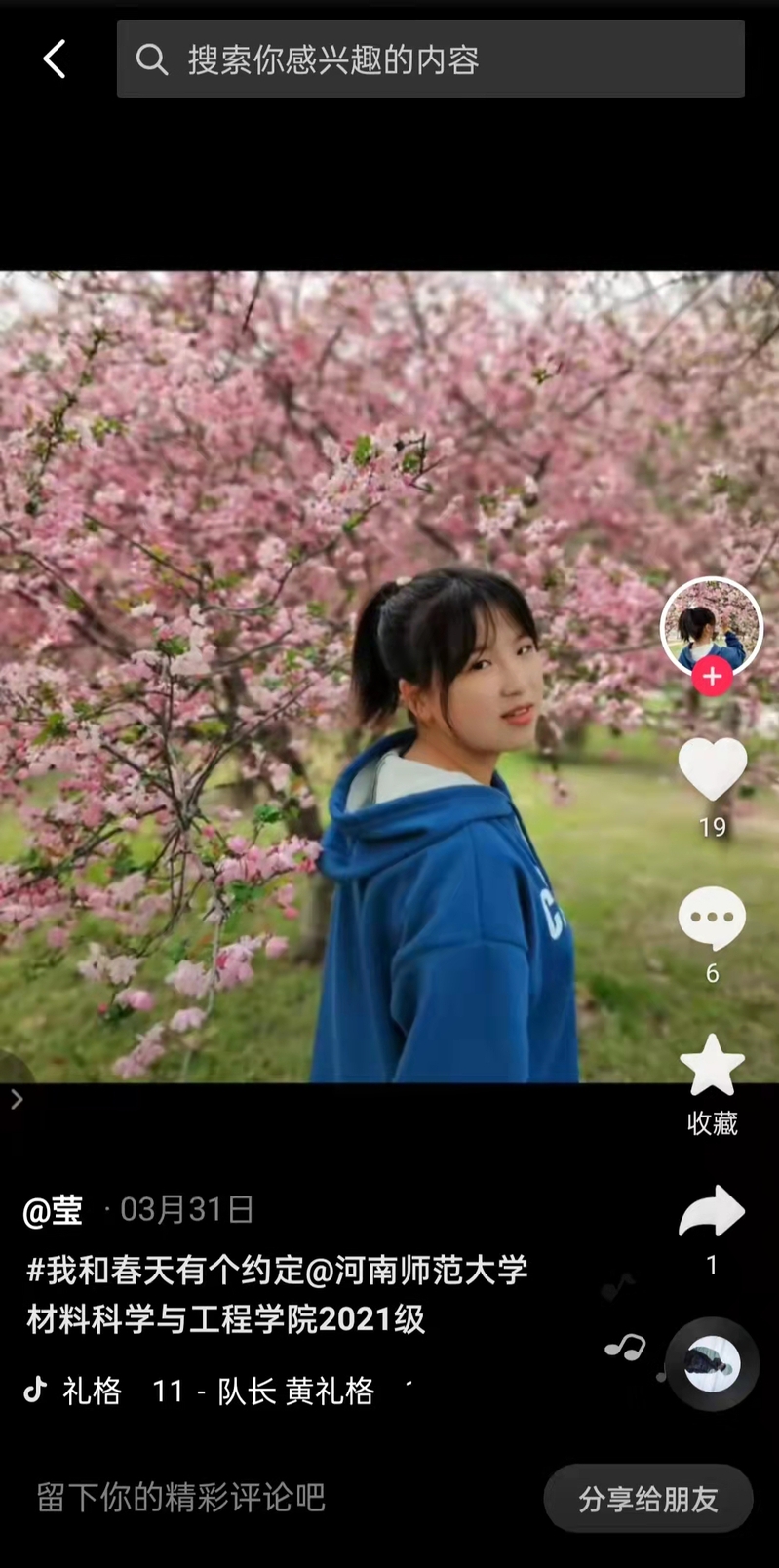 为让疫情下的校园生活丰富多彩、充满意义,材料科学与工程学院宣传小组特组织“我和春天有个约定”——短视频大赛,让同学们用视频记录下“我和春天的约定”,为绚丽的青春留下美好的瞬间。本次大赛于3月19日正式开始直至4月10日结束,共有54人参赛,经过评比,周佳,陈钰杰两位同学获得特等奖。
