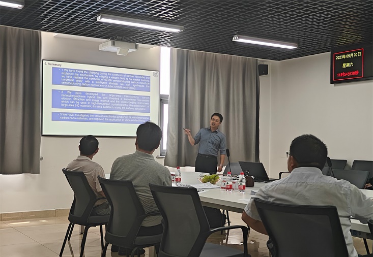 柳鹏副研究员从材料独特的几何尺寸出发,介绍了基于电场催化,通过金属和半导体型CNT密度的差异,实现高纯半导体CNT水平阵列的生长。同时讲解了化学气相沉积碳纳米管生长过程中的电子学效应、低维碳纳米材料的系列真空电子学特性及其在航天方面的应用;李鑫教授就光催化产氢技术面临的热力学以及动力学挑战,介绍了课题组对2D COFs光催化材料的理性设计与可控合成,主要包括对 COFs 层间界面,表面结构组成,D-A界面的优化和异质结界面精准调控,探究并揭示分子水平的催化机制,达到超高效的光催化分解水产氢活性,从而实现催化反应过程的耦合和功能集成。