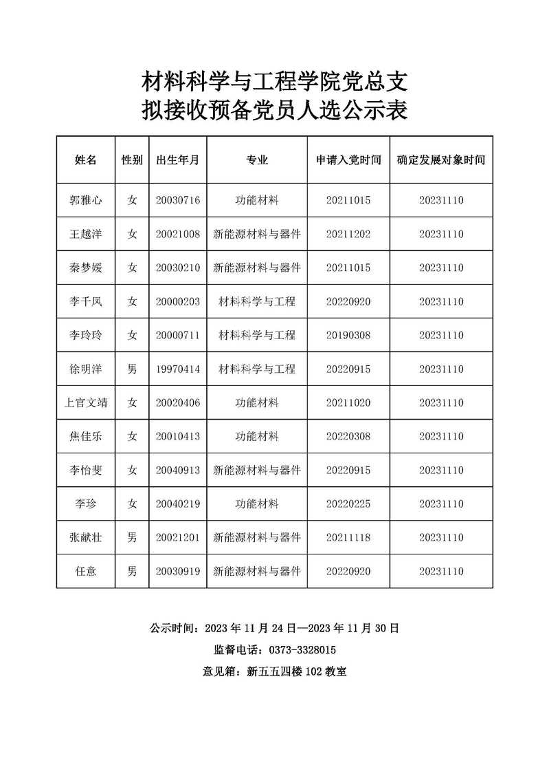 材料科学与工程学院党总支拟接收预备党员人选公示表