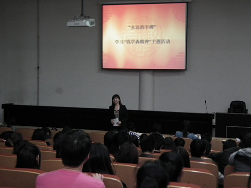 为积极引导大学生深入学习领会钱学森同志崇高的共产主义理想和爱国主义情怀、严谨求实的治学精神和淡泊名利的大家风范,4月14日晚7:30,软件学院在计科楼217报告厅举办“永远的丰碑”——学习钱学森精神主题活动。软件学院2011级辅导员赵娜及2011级全体学生参加了此次活动。