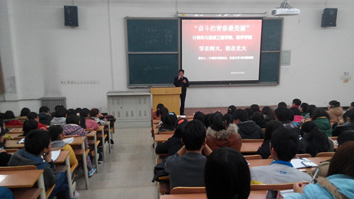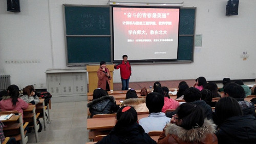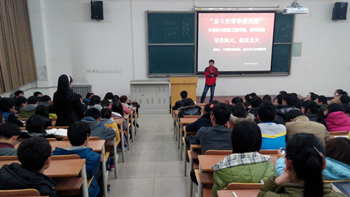 11月24日晚,北京大学教师、计算机学院校友孙中楠为同学们作了一场专题报告,主题是“奋斗的青春最美丽——学在师大,教在北大”。报告会在东区教学楼B楼203教室举行,学院党委副书记程保国、各年级辅导员,2012级、2013级全体学生干部及学生代表近300人出席了本次报告会,会议由院团委负责老师赵娜主持。