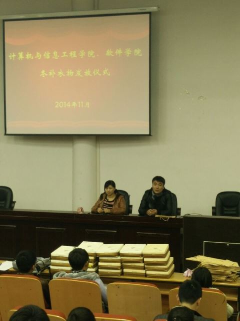 11月24日晚,计算机与信息工程学院、软件学院在计算机楼217多功能报告厅,举行了“冬季送温暖”冬补衣物发放活动。计算机与信息工程学院2012级辅导员赵娜、软件学院2014级辅导员原方、学院主要学生干部以及受资助的90余名学生一起参加了本次活动。