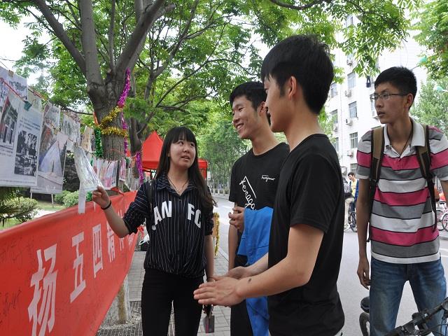 4月27日早上八点,志愿者们便积极地投入到本次五四精神宣传活动中来。到达摊位后,大家有序地悬挂了宣传条幅,并精心布置了五四精神图片展。本次照片展共分为两个部分,分别是“回顾历史”和“立足现在”。其中,“巴黎和会”、“二十一条”、“北京学生示威游行”、“火烧赵家楼”等40余张极具历史意义的图片资料带大家回顾了“五四运动”的历史过程;“立足现在”部分主要是我院学习“五四精神”志愿活动为主题的图片展。活动一开始,就吸引了众多师生驻足观看。在图片讲解员的引导下,观看的师生对每张图片的背景和意义有了更深入的了解,同时也对志愿活动的参与者表示肯定和鼓励。最后,参与的师生纷纷在“弘扬五四精神,争做有为青年”的宣传条幅上签名留念,以此来表达自己坚定不移的爱国之情。