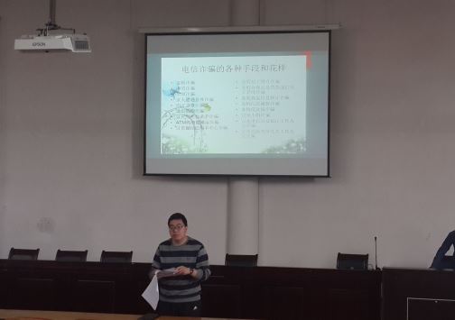 再次,王老师概括了近年来发生的电信诈骗案和电信诈骗案的主要特点:作案地点相对集中;受害群体成分多元;手段隐蔽,多为团体设局诈骗;危害大,涉案金额多。并列出了电信诈骗的大概的类型:网络购物诈骗;网络刷信誉;网络兼职;冒充领导;猜猜我是谁;以恐和形式诈骗;信用卡恶意透支;活动中奖;购物退税;生育保险金;保险分红;冒充房东;以家人为由头进行诈骗;冒充银行信用卡中心诈骗;虚假招工、婚介、办理驾驶证诈骗;虚假办理高息贷款、信用卡套现诈骗;新型网络QQ诈骗等形式。通过王老师的讲解全体同学对电信诈骗层出不穷的手段及防范措施都有了更深入的了解。