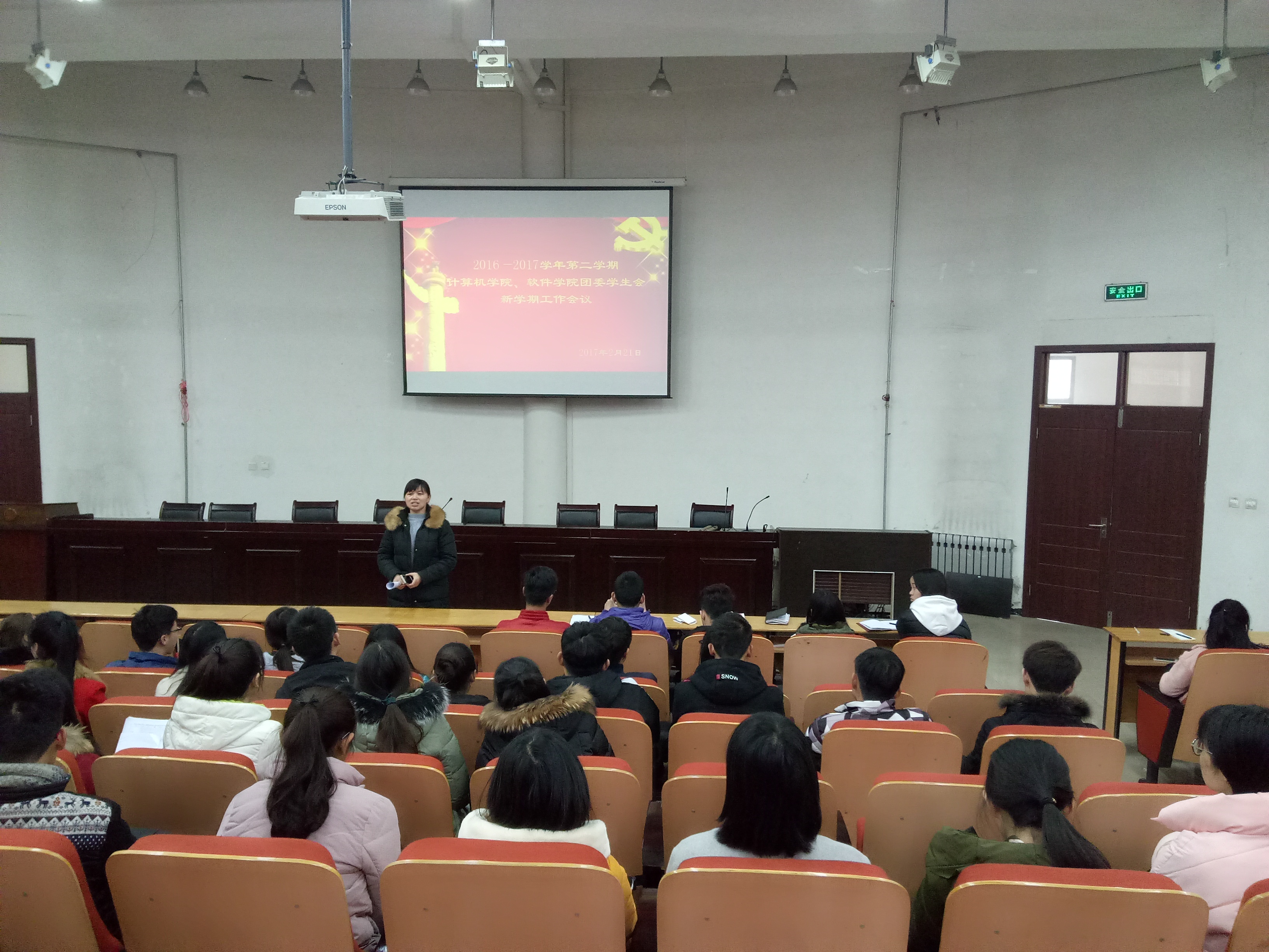 会议伊始,赵娜老师回顾了上学期工作的开展情况,肯定了团委学生会全体成员的辛苦付出,同时指出团学干部还需要不断完善自我,做好模范引领作用。随后,赵娜对新学期工作要点进行讲解,重点对团属新媒体建设,2017年网络作品征集活动,学院计算机科学文化节等方面进行了介绍,并对新学期工作安排进行了重点部署。赵老师指出,高年级团学干部要做好低年级团学干部的培养和选拔工作,低年级团学干部要积极表现,不断历练,挖掘潜力,为团学建设贡献自己的力量。最后,赵娜指出,全体学生干部应加强学习,紧跟时代脚步,积极学习最新理论知识和政策,按照高标准、高质量严格要求自己,提高组织纪律性,增强团队协助能力,良好协调学习和工作的关系,让自己真正成为社会栋梁人才。