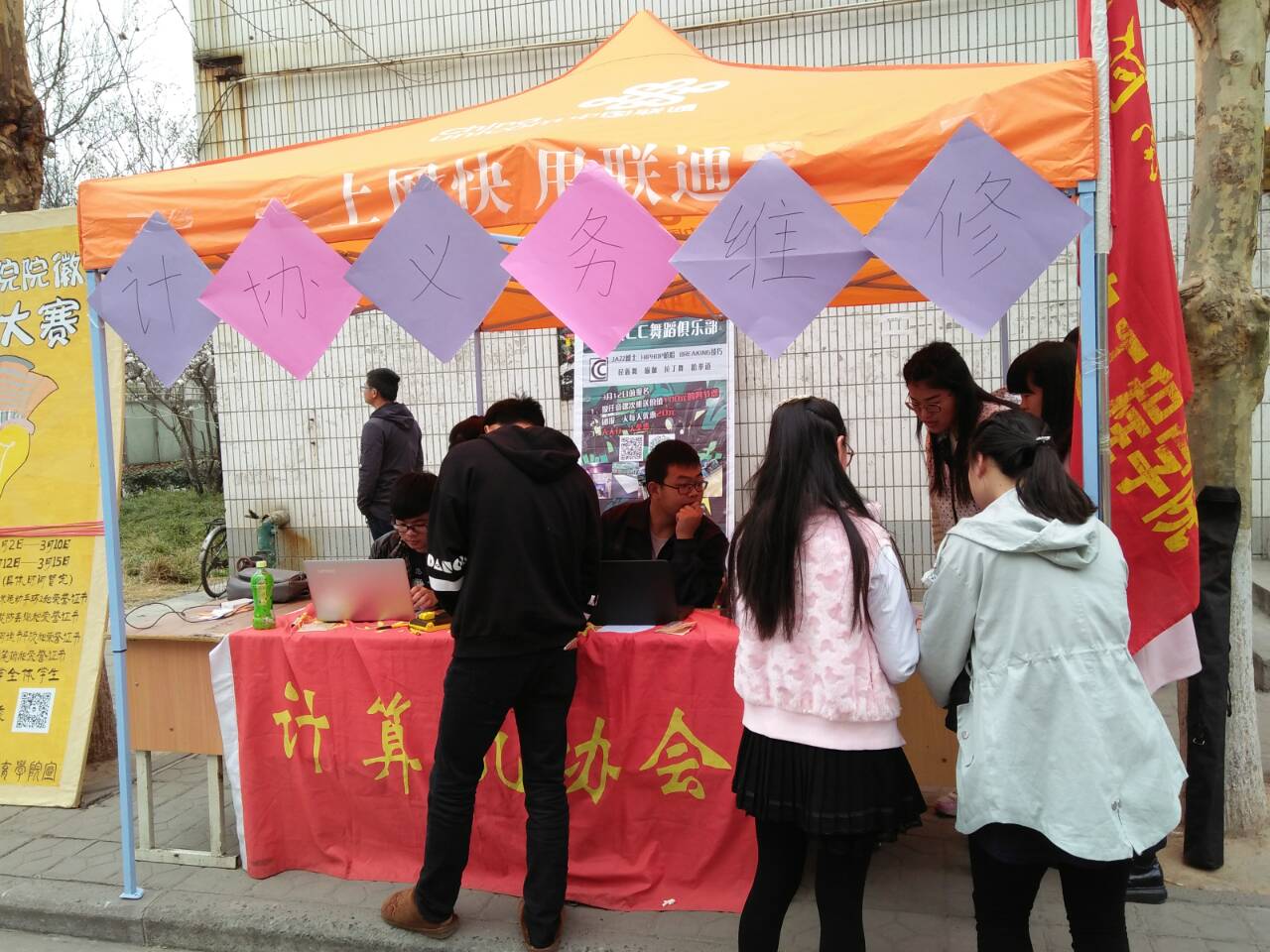 本次活动分两个阶段,第一阶段:设置摊位,现场服务;第二阶段:不分时间,上门服务。第一阶段于3月11日-12日在我校万人餐厅西南角处设立摊位,加强宣传,义务服务。11日早上七点多,计算机协会成员便早早的来到活动地点,布置摊位,准备维修工具,发放宣传单页,为服务同学们做好准备。活动于九点正式开始。活动之前,承办方已通过三大网络平台进行较大范围的前期宣传,活动当天受到了广大学生的支持,众多学生来到帐篷前热切地询问有关计算机方面的问题,工作人员耐心地逐一解答,对于需要重装系统、安装软件或者硬件维修的电脑,工作人员也认真熟练地进行处理。同学们内心充满了感激,热心地为工作人员递上热水。当日气温较低,还下着绵绵春雨,但这并没有影响同学们的服务热情,每一位工作人员的额头上都渗出密密的汗珠,当听到同学们离开时真诚地感谢,即使非常疲惫,大家的脸上仍非常开心,疲惫感也一扫而光。在全体成员两天的辛苦劳动后,义务维修电脑志愿服务活动落下帷幕,首战告捷。第二阶段的展开比较灵活,全校师生可以根据宣传单页或网络宣传平台上提供的联系方式,与我院志愿服务团队成员联系,根据无课时间安排上门服务,这样既节省了同学们的时间,也便于提供及时、高效的服务,得到学生的一致认可。据悉,此志愿服务活动将持续进行,为同学们提供长期服务。