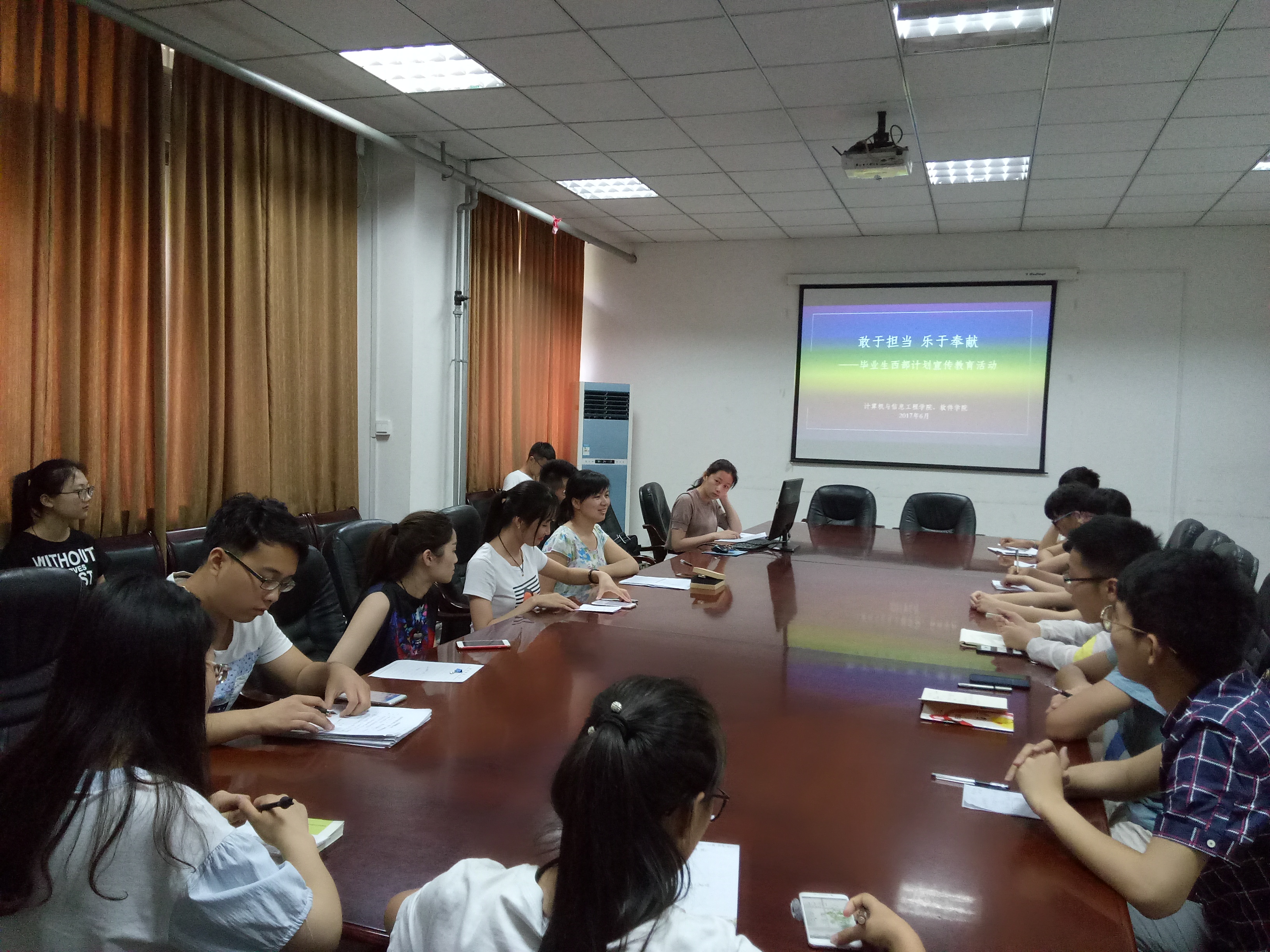 为积极响应校团委的号召,鼓励更多的毕业生报名参与西部计划,投身于祖国最需要的地方。5月23日中午,计算机与信息工程学院在103会议室举办了以“敢于担当 乐于奉献”为主题的毕业生西部计划宣传教育活动。计算机与信息工程学院部分有意愿的毕业生代表参加了此次活动。活动由院团委副书记赵娜主持。