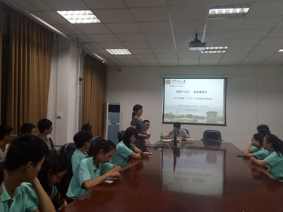 磨刀利宝剑,他日试锋芒。为积极响应共青团中央、团省委、校团委“喜迎十九大,青春建新功”的号召,有条不紊地开展暑期社会实践工作。7月3日晚,计算机学院、软件学院在计算机学院103会议室组织召开暑期“三下乡”社会实践活动计算机实用技术交流会。院团委副书记赵娜、2016年暑期社会实践团队长潘诗杰、队员琚致远以及2017年社会实践团全体队员共同参加了交流会。