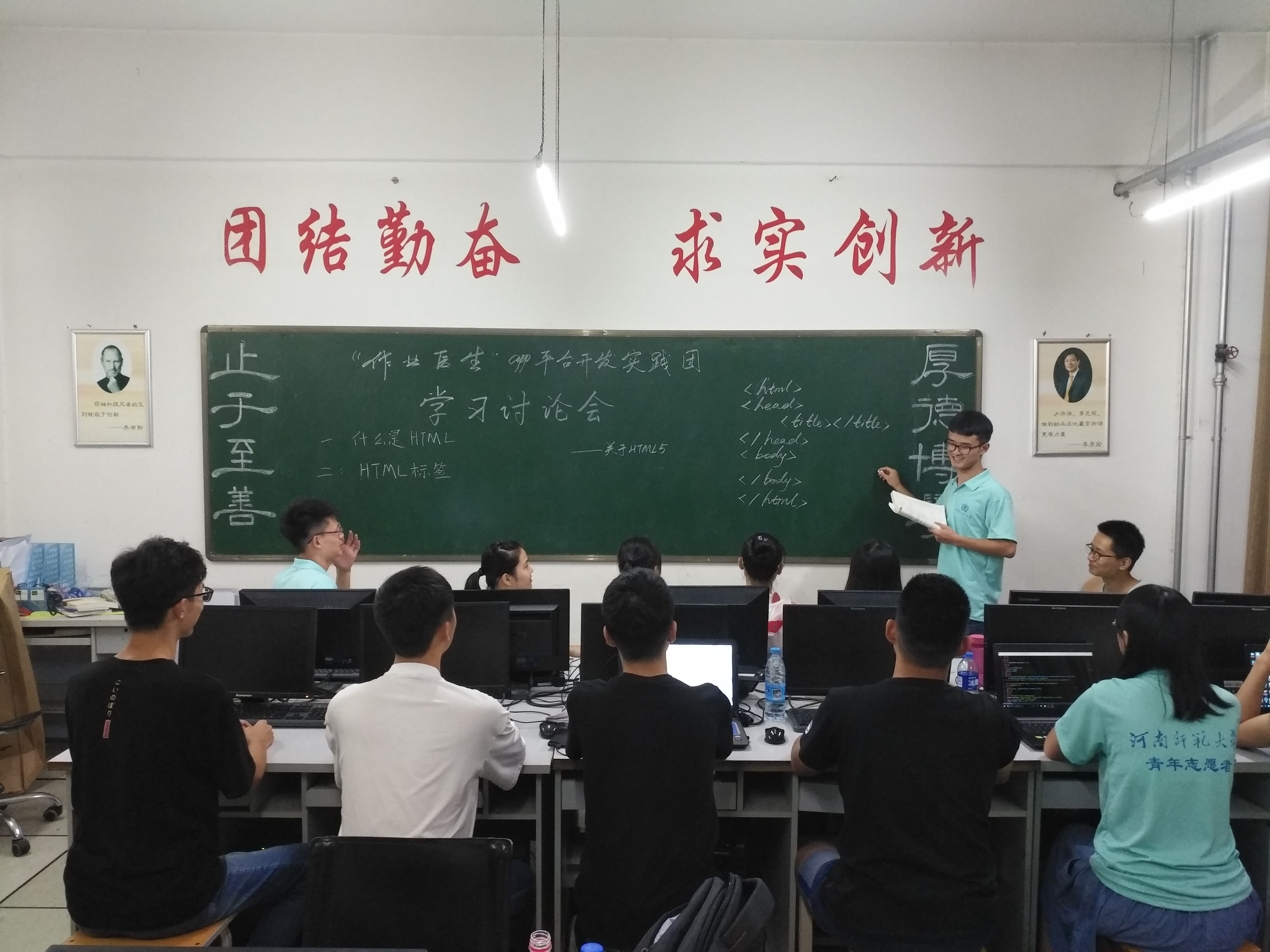 7月10日下午,“作业医生”智慧教育app平台开发实践团在计算机学院109科技创新基地组织召开HTML5学习讨论会,实践队员吕家兴为全体队员作关于HTML5的讲解。