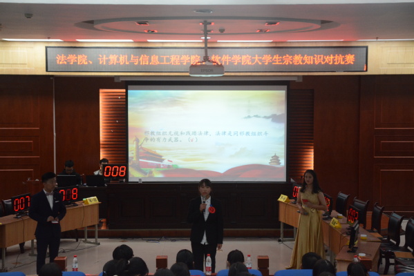 为深化青年大学生对宗教历史发展的认识,11月7日,由法学院、计算机与信息工程学院、软件学院联合组织的大学生宗教知识对抗赛在模拟法庭如期举行。法学院团委书记马淑明、计算机与信息工程学院辅导员敦洁、软件学院辅导员李淳及百余名学生共同参与此次竞赛。