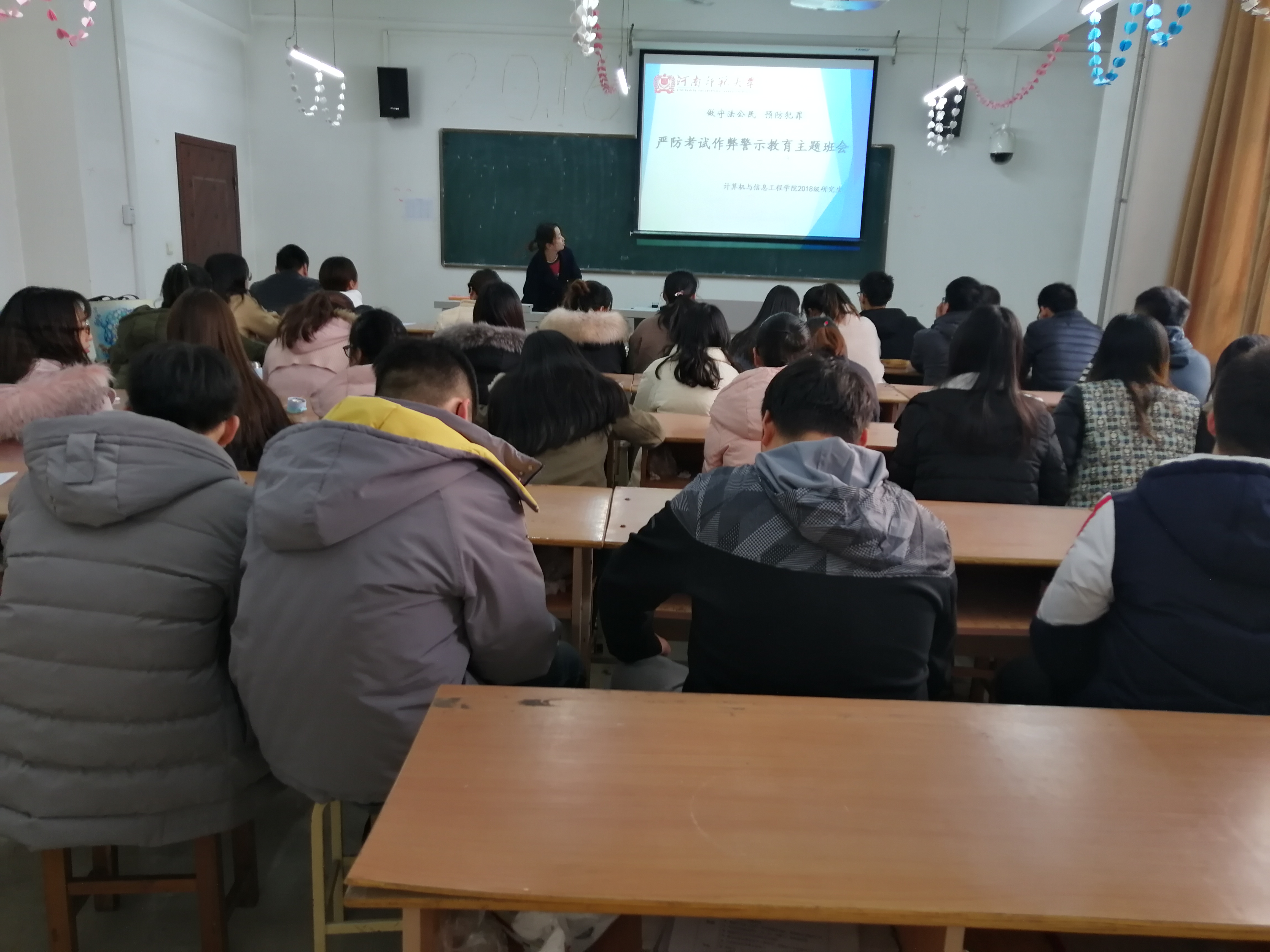 2018年12月22日至23日为全国研究生考试时间,为了加强大家的法律意识,严防学生参与替考、助考等舞弊活动,计算机与信息工程学院2018级全体研究生在计科楼318教室开展了“严防考试作弊警示教育”主题班会活动,此次活动由班长黄笑妍主持。