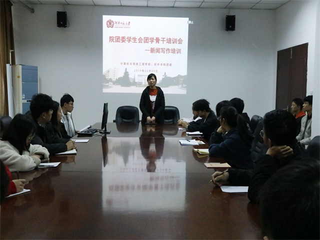 本次培训会内容分为三个部分。第一部分,孟书杰就学生记者密切关注的问题——如何提升新闻敏感度向大家分享经验。她讲到,要多观察、多思考,善于从日常的学习、生活中发现新闻,在长期的实践中接受锻炼。第二部分,孟书杰细致讲解新闻类别、结构、组成等新闻写作基础知识。讲解过程中,孟书杰通过提问等方式与与会人员互动交流,充分提高了团学骨干的积极性。第三部分,实例讲解。孟书杰对于典型新闻稿做了详细分析并改正,鼓励团学骨干利用河南师大报、蓝天网、校团委等媒体渠道,提高新闻素养。最后,赵娜对本次培训会作出了总结并对团学骨干提出要求:希望与会人员将培训内容入脑入心,继续勤学勤练,加强交流,提升自身能力,增强新闻素养,为未来职业发展奠定坚实基础。